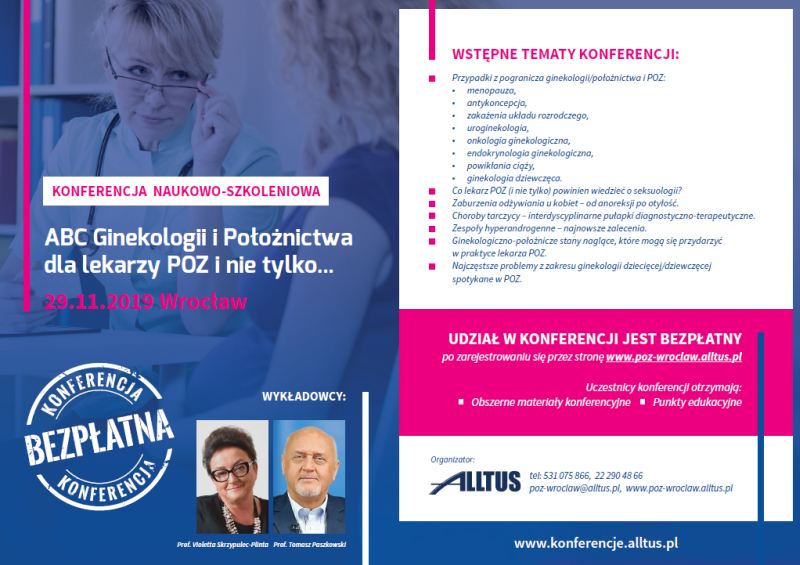 W imieniu Pani Prof. dr hab. Violetty Skrzypulec-Plinta i Pana Prof. dr hab. Tomasz Paszkowskiego miło mi poinformować, że w sześciu dużych miastach Polski organizowany jest wspólnie z firmą ALLTUS cykl Konferencji „ABC Ginekologii i Położnictwa dla lekarzy POZ i nie tylko…”.