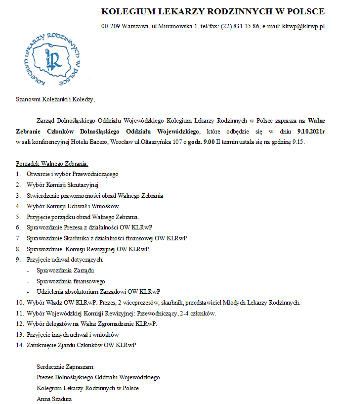 Zarząd Dolnośląskiego Oddziału Wojewódzkiego Kolegium Lekarzy Rodzinnych w Polsce zaprasza